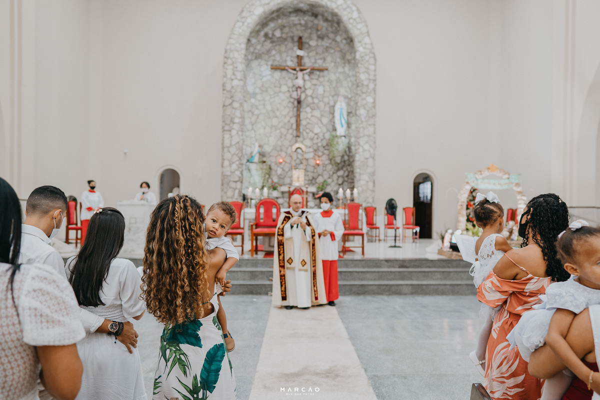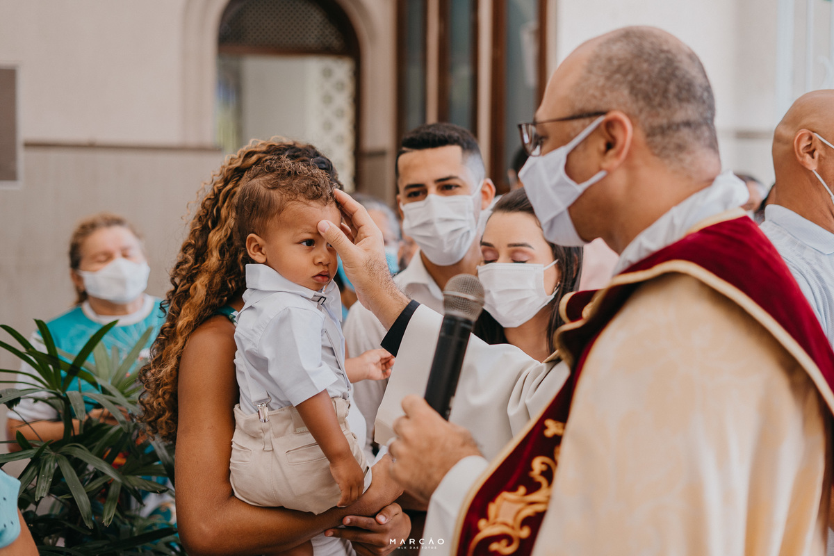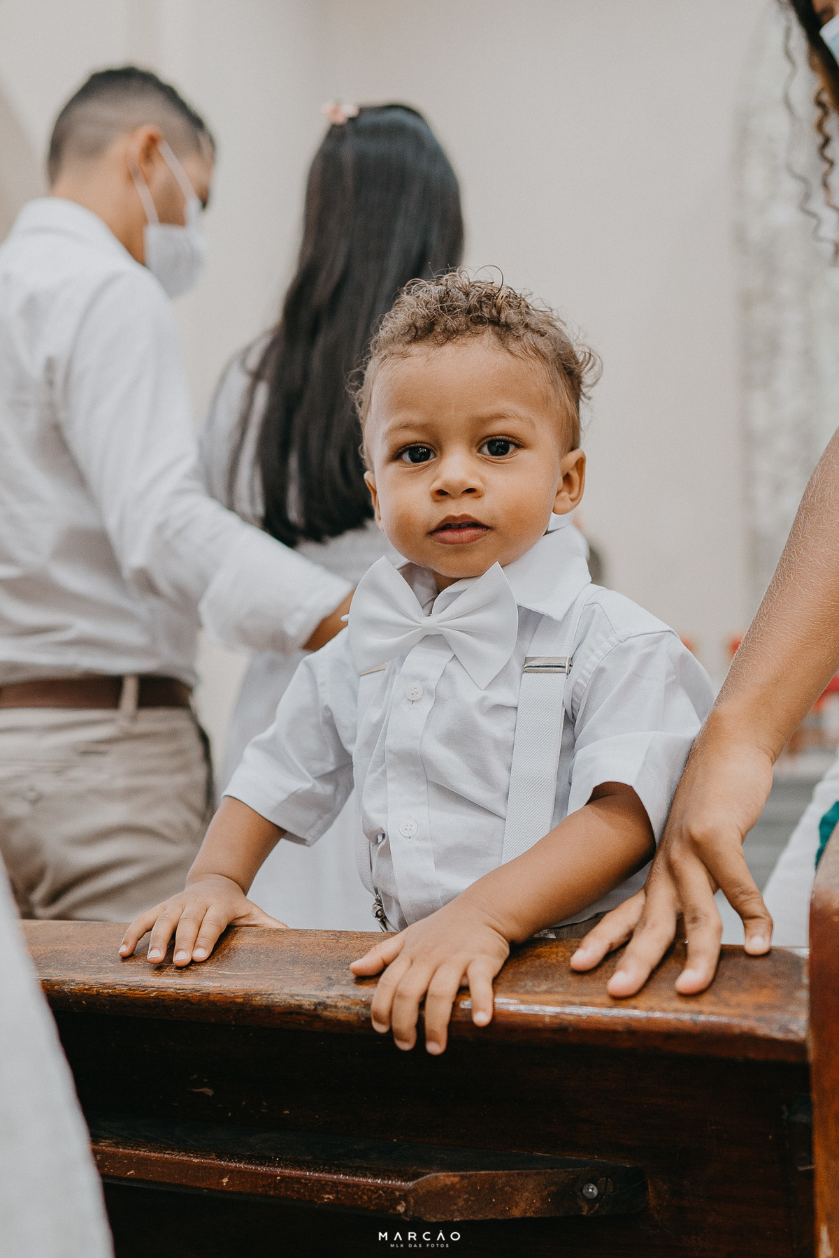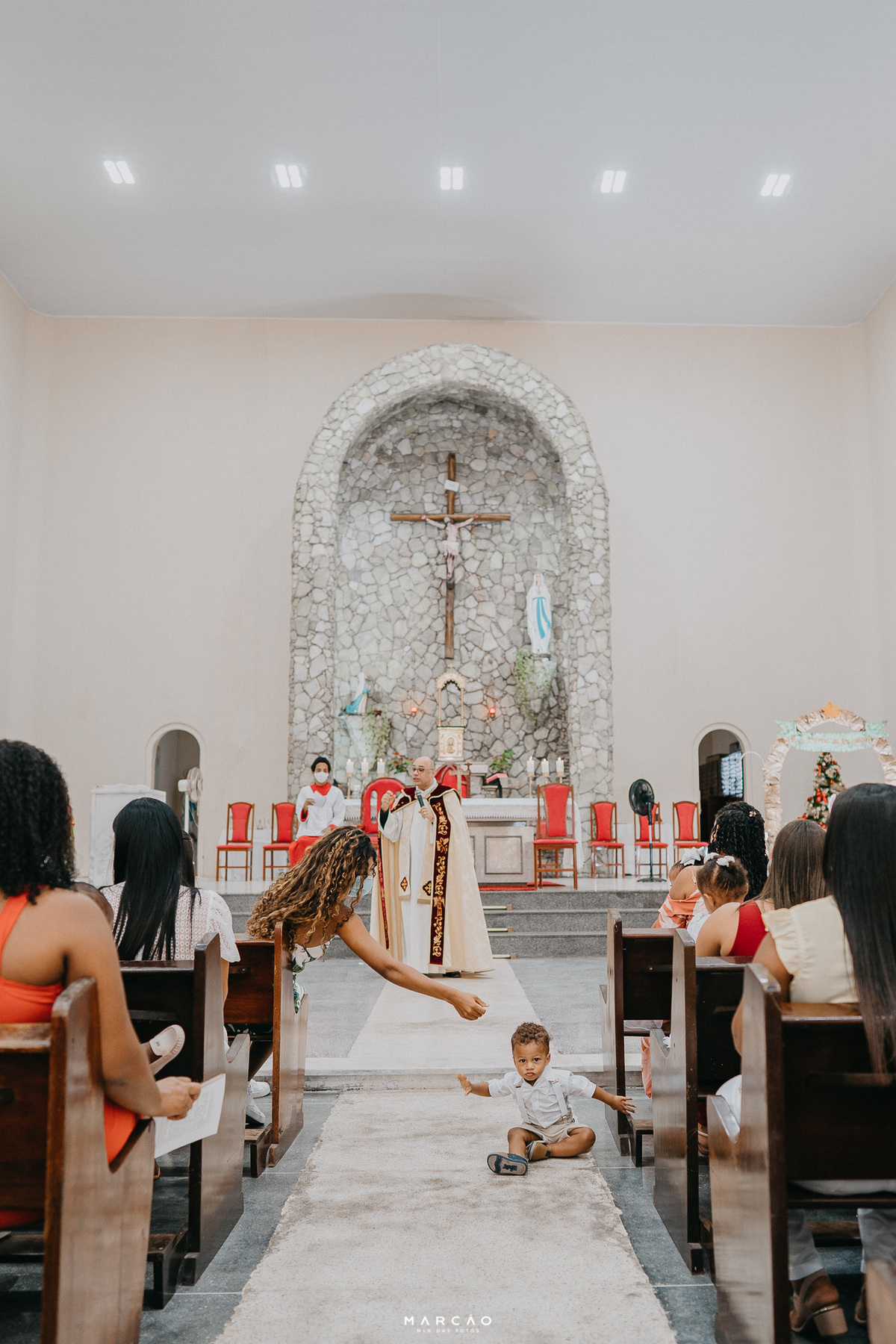 Caue é uma criança calma e super sorridente. Durante a cerimônia ele prestava atenção, interagia com o padre e principalmente com os familiares. Quando a criança está distraída durante a cerimonia é uma delícia para registrar esses momentos de amor e brincadeiras entre eles, sem duvidas é a parte que eu mais gostooooo. Foi perfeito, nesse dia ele até descobriu que o "fogo" queima ushuashuahs, tadinhoooooo 😂