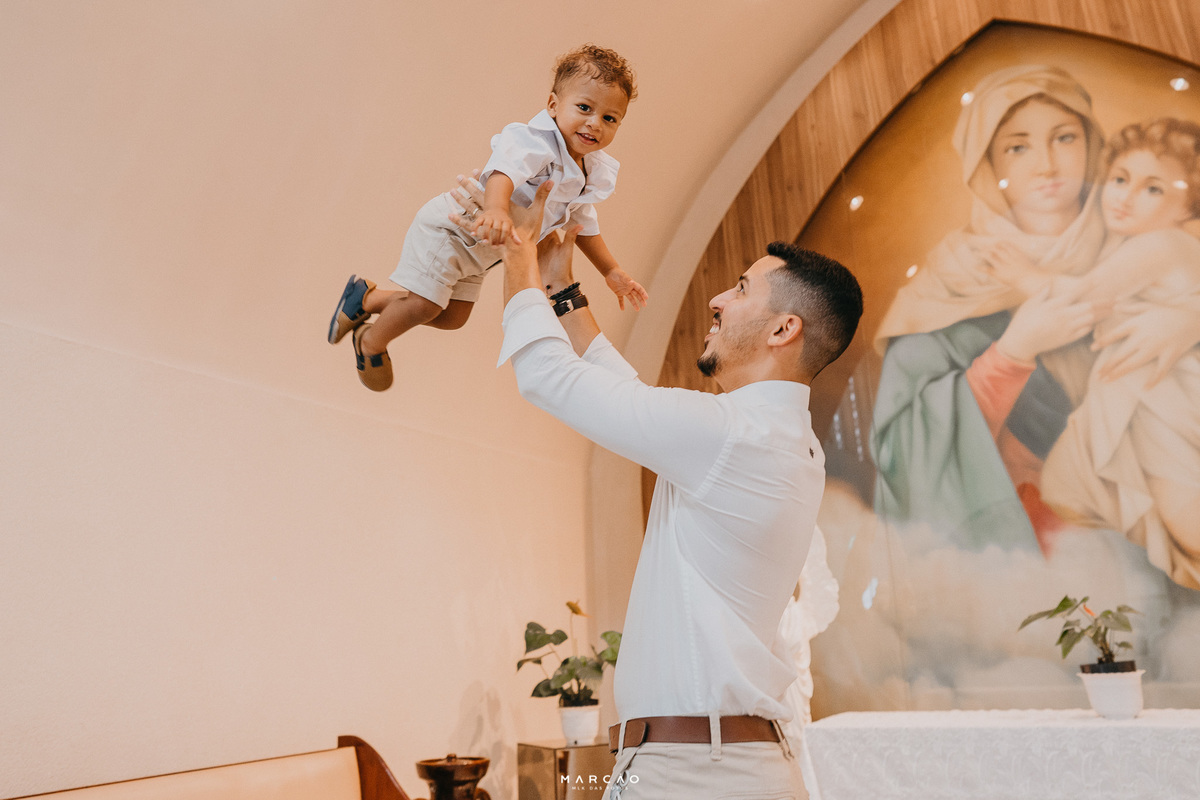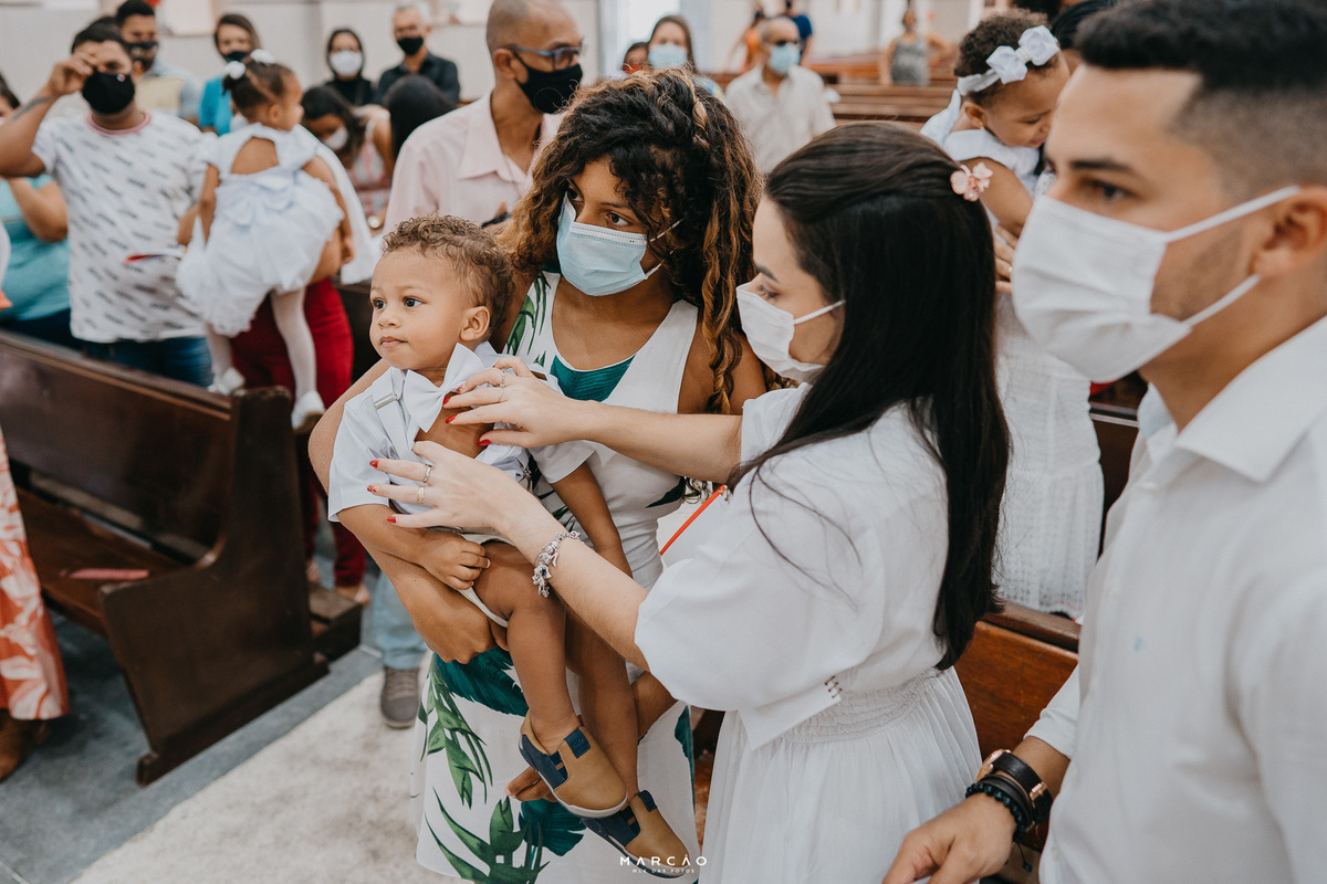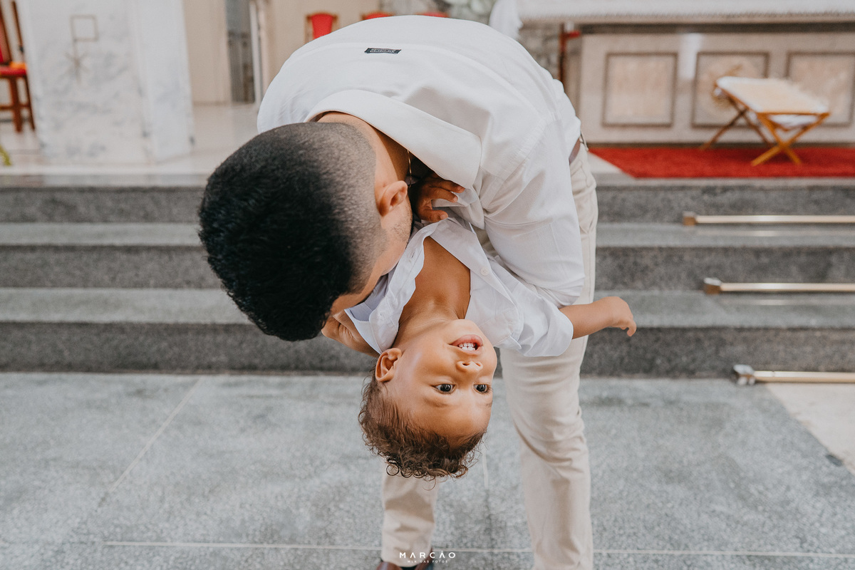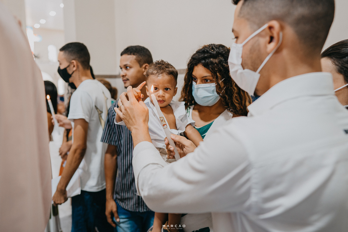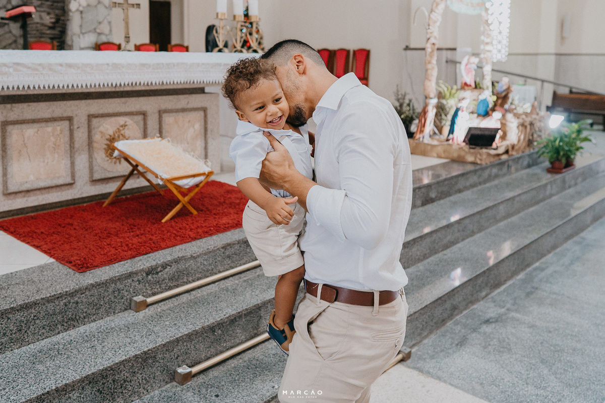 Caue é uma criança calma e super sorridente. Durante a cerimônia ele prestava atenção, interagia com o padre e principalmente com os familiares. Quando a criança está distraída durante a cerimonia é uma delícia para registrar esses momentos de amor e brincadeiras entre eles, sem duvidas é a parte que eu mais gostooooo. Foi perfeito, nesse dia ele até descobriu que o "fogo" queima ushuashuahs, tadinhoooooo 😂